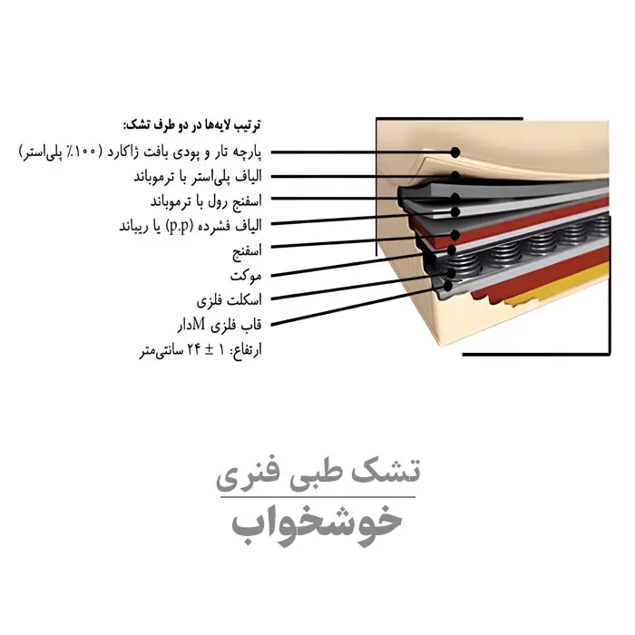 تشک طبی فنری خوشخواب طبی بوده و از نوع تشک های نیمه سفت خوشخواب محسوب می شود. درجه سفتی سطح آن در مجموع عدد ۷ از ۱۰ را نشان می دهد. در صورت استفاده از این تشک، ستون فقرات بدن آسیب نخواهد دید. ساختار این تشک به گونه ای است که فرم بدن روی تشک در حالت مناسبی قرار می گیرد و گزینه مناسبی برای افرادی است که از مشکلاتی مانند درد عضلاتی یا مفصلی رنج می برند یا مایل هستند از ابتلا به کمردرد و ضایعه های ستون فقرات، پیشگیری کنند.