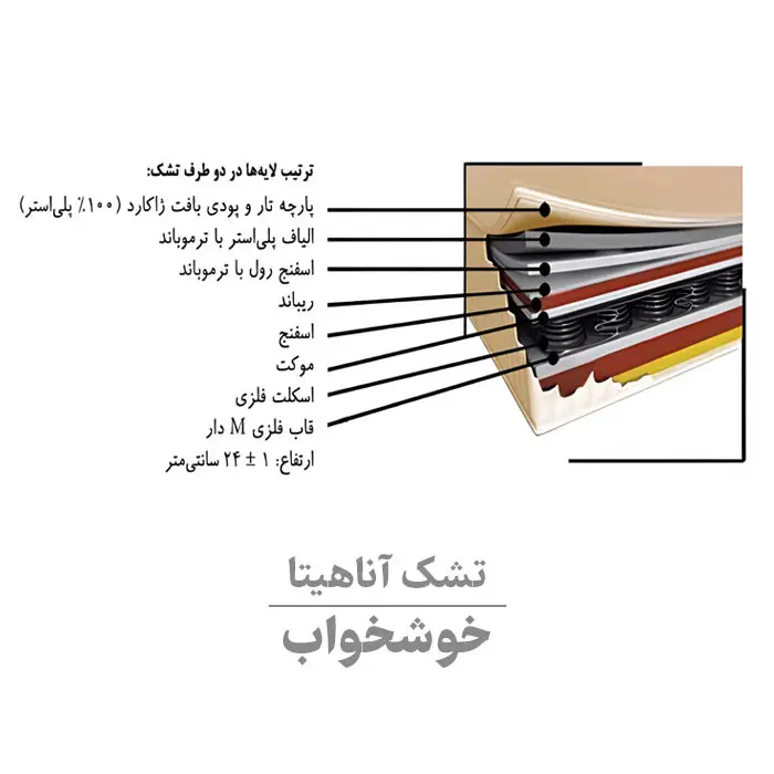 تشک یک نفره طبی فنر متصل مدل آناهیتا (Anahita) از برند خوشخواب یکی از مدل های طبی فنر متصل تولیدی این شرکت است. دوام مناسب، تحمل وزن متوسط، پارچه ضدحساسیت و کمک به خواب افراد مبتلا به دردهای نه چندان شدید به همراه ۵۰ ماه (۴ سال و ۲ ماه) گارانتی معتبر، با ۲۴ سانتی متر ارتفاع، از مختصر ویژگی های تشک طبی فنری نوجوان آناهیتا می باشد.